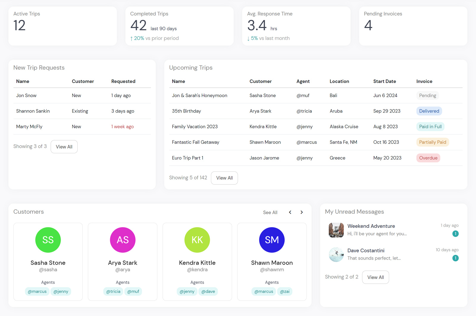 Experience the ultimate command center for your travel agency by monitor key performance indicators, manage invoices seamlessly, respond promptly to new trip requests, gain valuable customer insights, and stay on top of communication with clients—all in real-time.